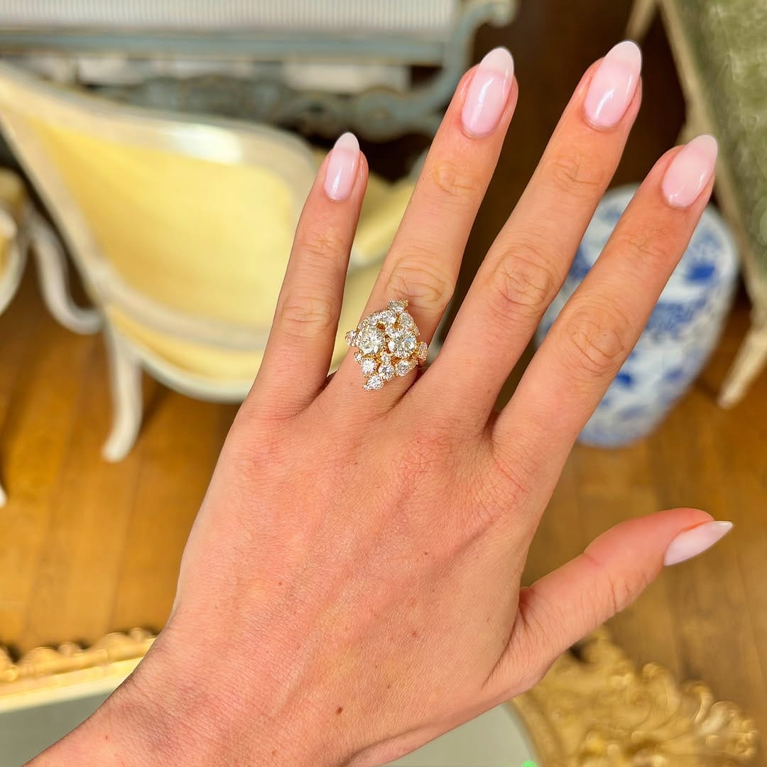 One of the most appealing features of this design is its versatility. The cluster setting pairs effortlessly with wedding bands or can be worn alone as a statement piece. Whether for a proposal, anniversary, or meaningful celebration, this ring expresses love and commitment with lasting beauty.
