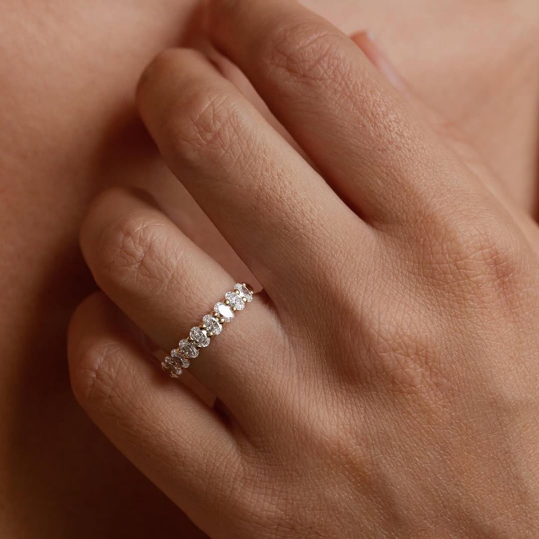 The oval cut design enhances each stone’s natural sparkle while offering a graceful shape that flatters the hand. Unlike traditional round bands, oval cuts create a unique elongated look, making the ring appear even more radiant. Because of its half eternity style, it combines both luxury and comfort, allowing for daily wear without compromising on sophistication.