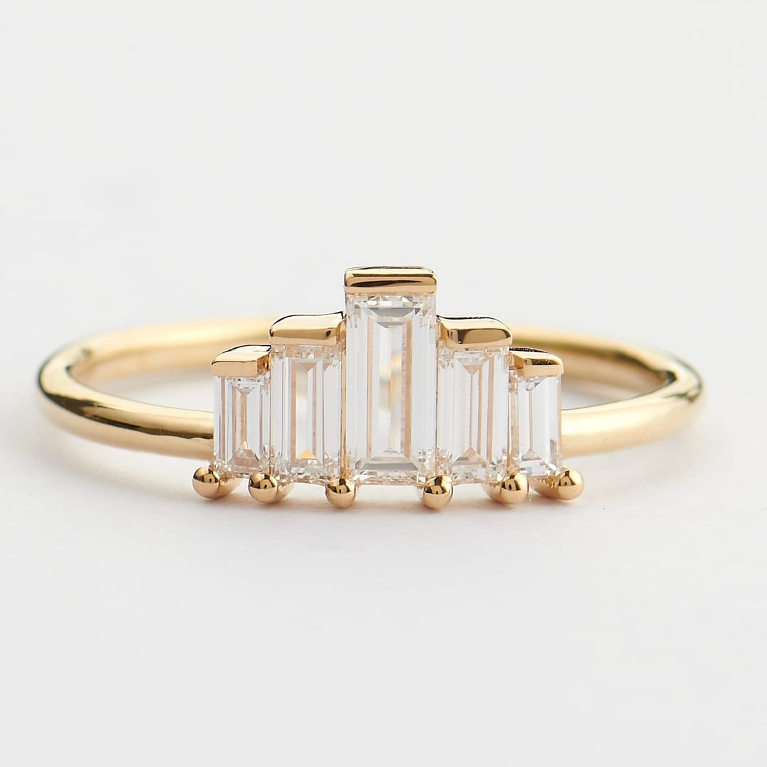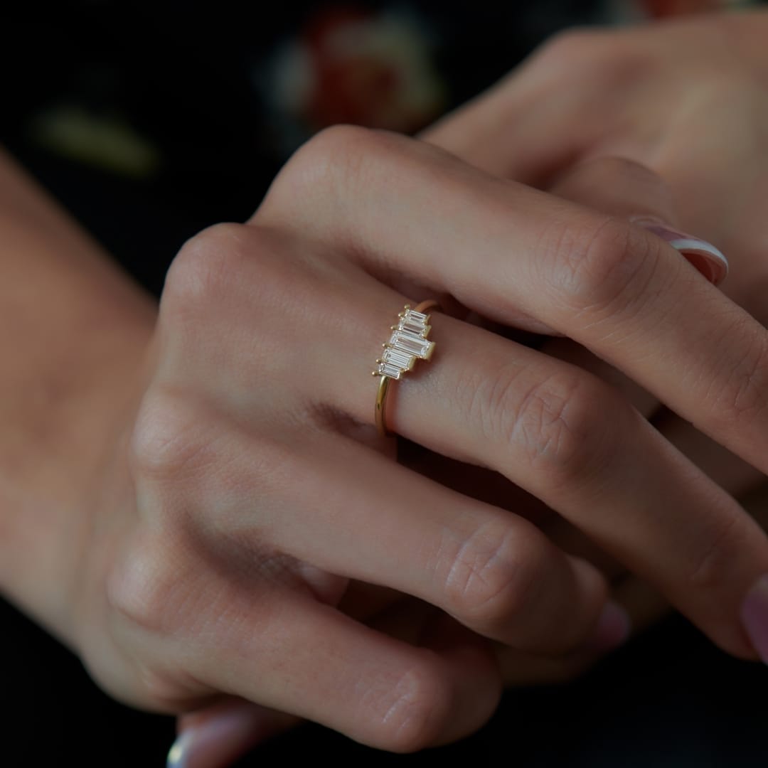 The clean lines and geometric sparkle of the baguette-cut stones create a modern yet classic aesthetic. Therefore, the ring is an ideal choice for pairing with other jewelry or wearing as a stand-alone statement piece. Because it’s so versatile, you can style it effortlessly for work, parties, or family celebrations.