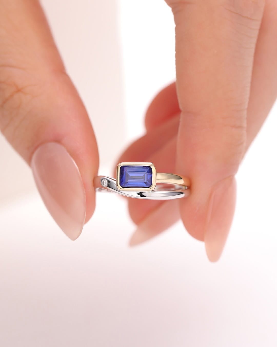 1.50Ct Blue Emerald Cut Bezel Set Ring | Two Tone Promise Ring for Mother’s Birthday | Elegant Jewelry Gift for Her1.50Ct Blue Emerald Cut Bezel Set Ring | Two Tone Promise Ring for Mother’s Birthday | Elegant Jewelry Gift for Her