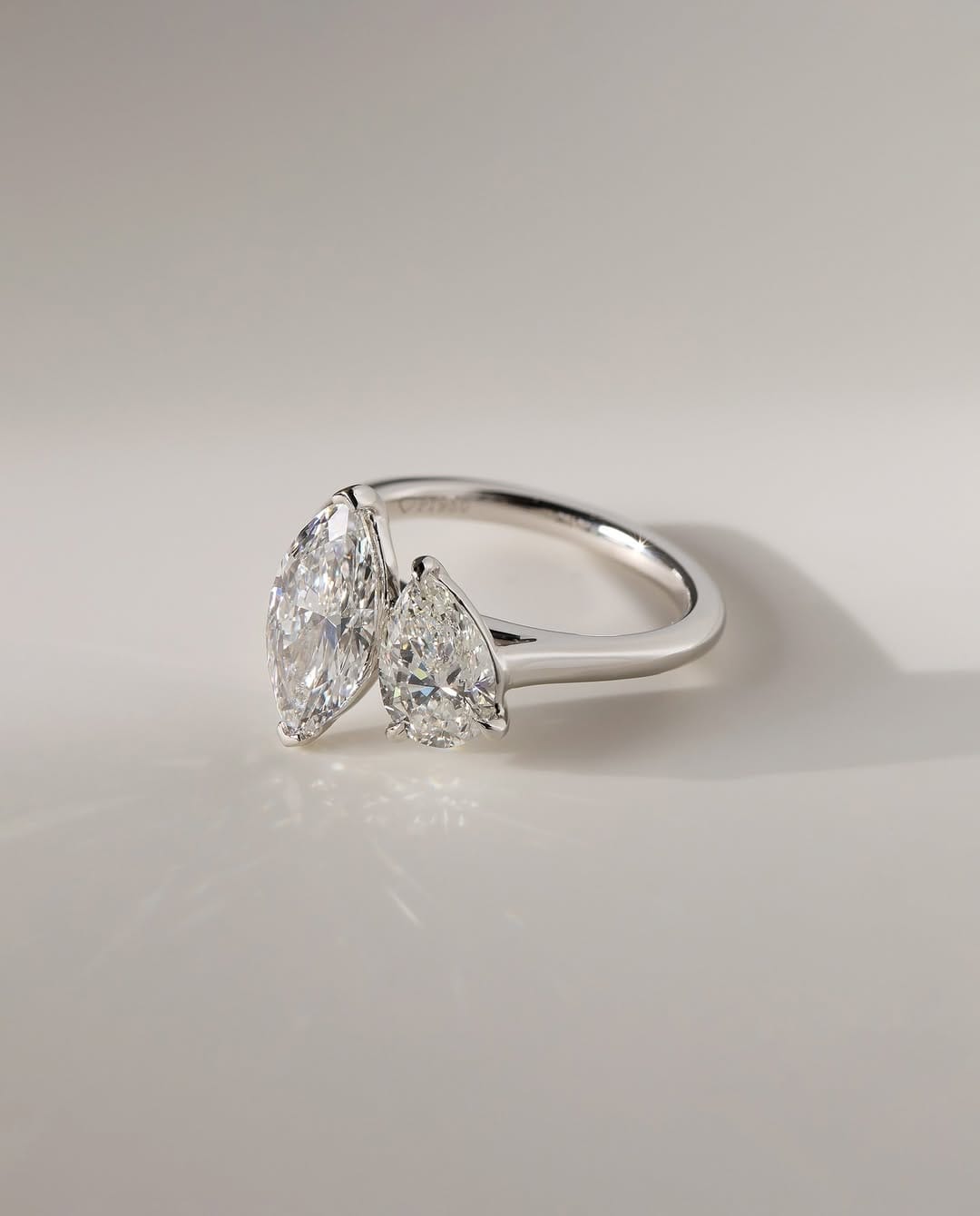 The marquise cut creates a sleek, lengthening effect on the finger, while the pear cut adds softness and romance. Set side-by-side, they form a striking visual contrast that represents balance and unity in a relationship.