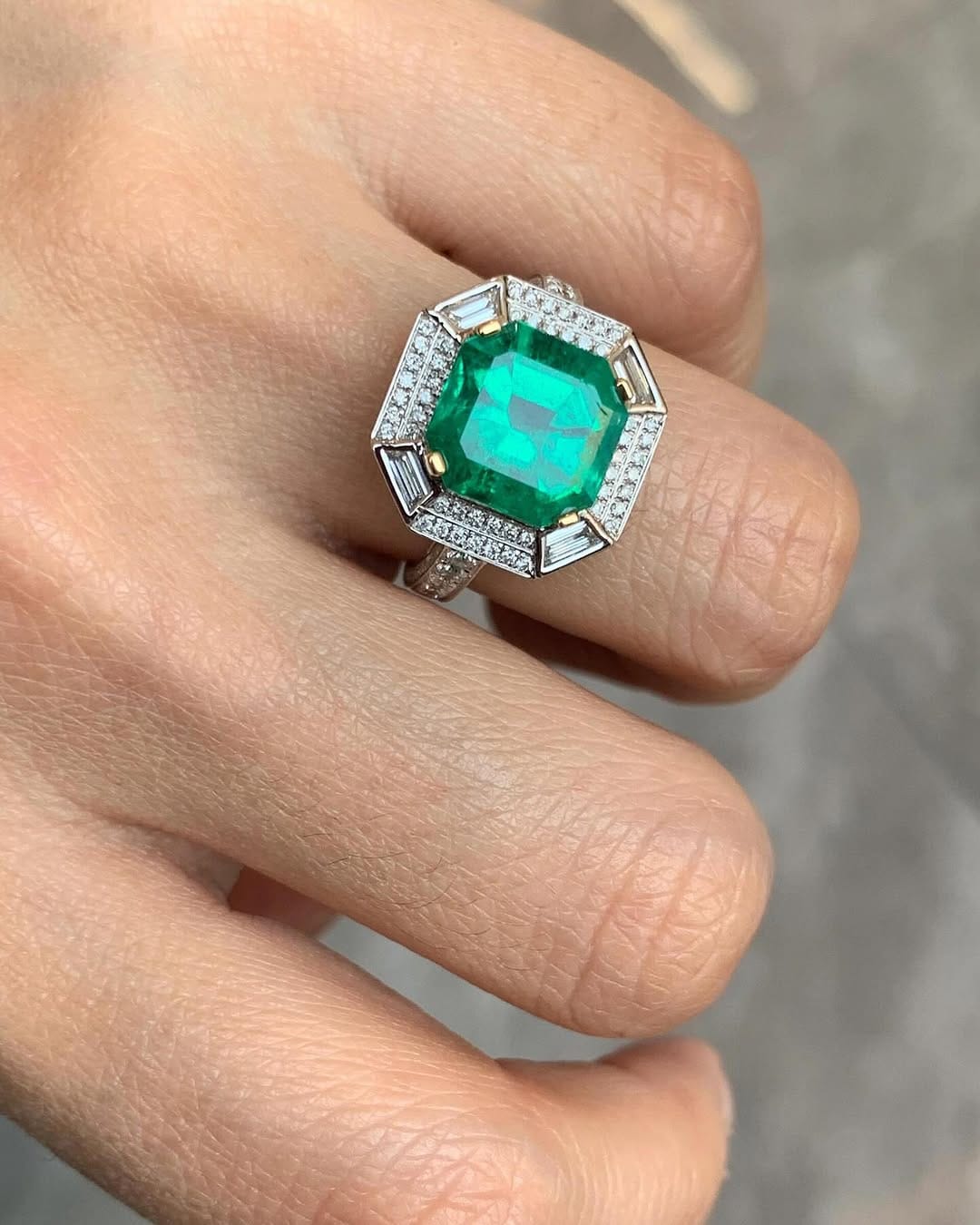 This green asscher cut halo ring makes a meaningful gift for women. Whether it is a bridesmaid present, an anniversary surprise, or a luxury self-purchase, the vibrant green stone symbolizes growth, balance, and renewal. Moreover, its versatile style allows it to complement both formal and casual outfits.