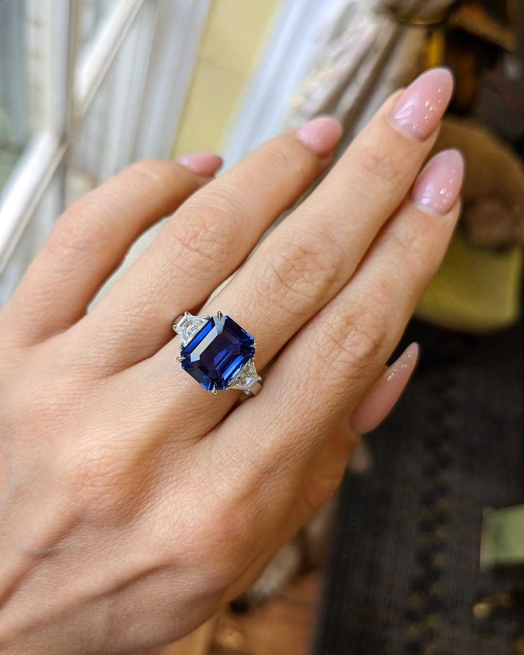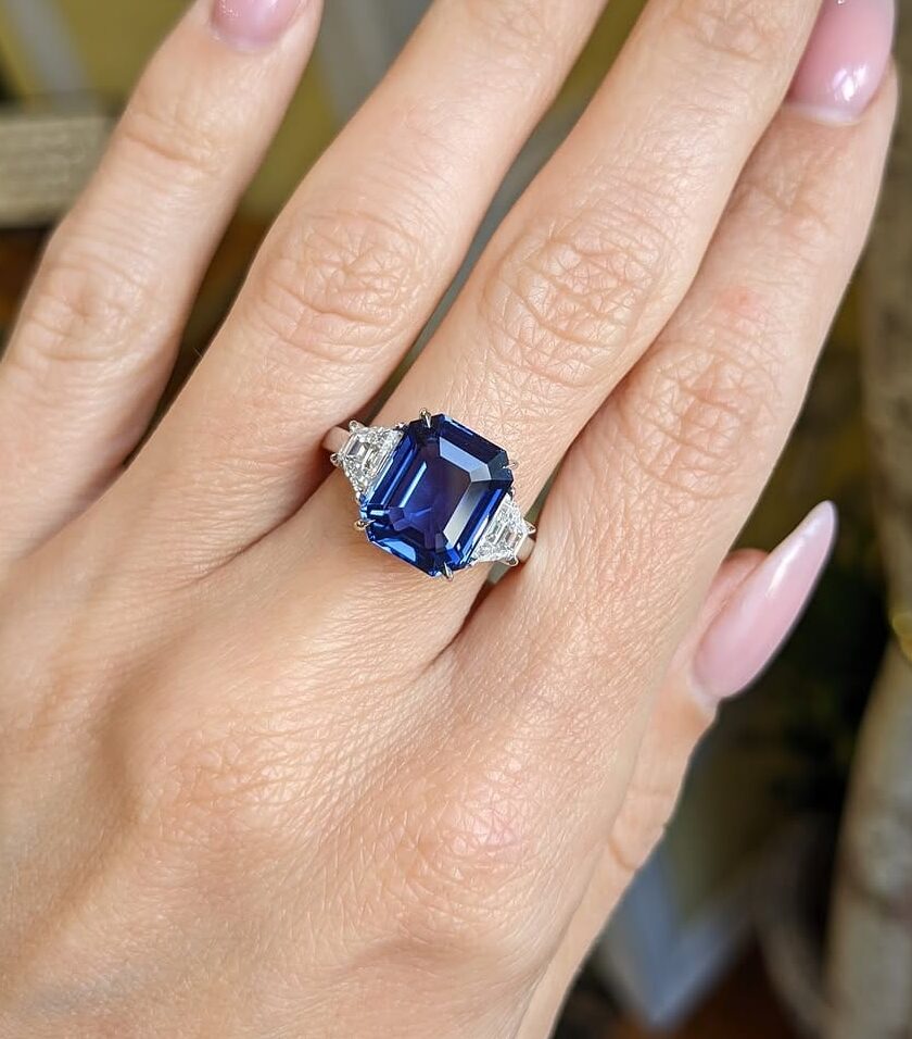 The emerald cut sapphire brings a modern, sleek touch to this ring. Its long facets catch the light in a unique way, making the sapphire appear bold and striking. Paired with side stones, the result is a ring that looks both sophisticated and powerful.