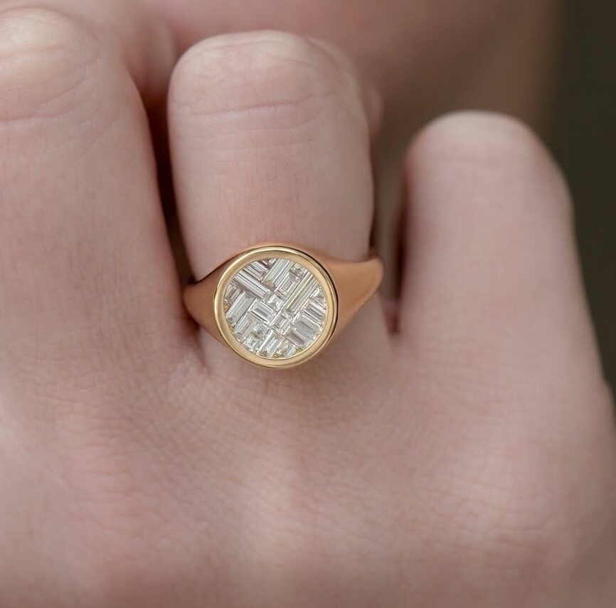 The mix of the cluster setting and the signet shank creates a striking look. Therefore, you can pair it with cocktail dresses, business attire, or casual outfits. As a result, the White Baguette Cut Cluster Ring works for almost any occasion.