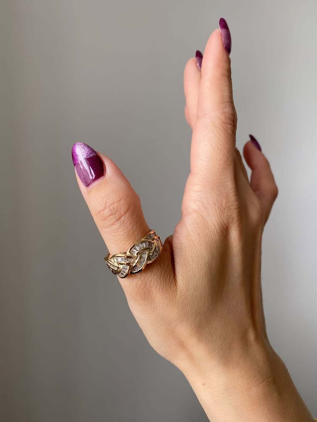 The design features a row of baguette-cut stones that shine with a subtle yet refined brilliance. Each stone sits securely in a polished channel setting, giving the band strength and durability. The channel style also provides a smooth surface, which makes the ring comfortable and practical for daily wear. Unlike prong settings, which can catch on fabrics, the channel setting ensures a clean finish and a modern look.